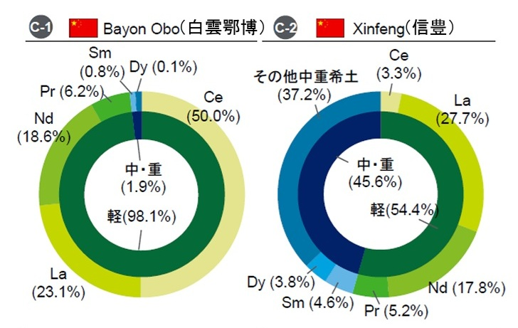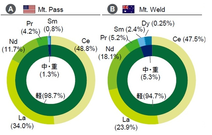 図のように、米国の鉱山はバストネサイト鉱床、豪州の鉱山はモナザイト鉱床であり、特に米国の鉱床は軽希土類の含有率が大きく、中重希土類の含有率が極めて小さいことが特徴です。また、中国の鉱床は北部は共生鉱が多く、米国、豪州の鉱山と同じく軽希土類が中心です。しかし、南部は中重希土類を多く含有するイオン吸着鉱の鉱床が多いことが知られています。