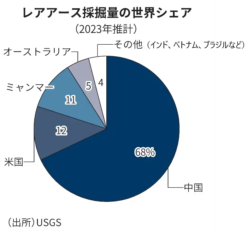 米地質調査所(USGS)によると、2023年のミャンマーのレアアース採掘量(推計)の世界シェアは中国(68%)と米国(12%)に次いで11%で3位になります。特にネオジム磁石に欠かせない重希土類と呼ばれるジスプロシウムとテルビウムは、中国、ミャンマー、ベトナムに偏在するので、その鉱床は世界的にみても重要な位置づけとなります。特にミャンマーの重希土類は2023年には世界供給量の約60%を占めていて、その安定供給が問題となっています。