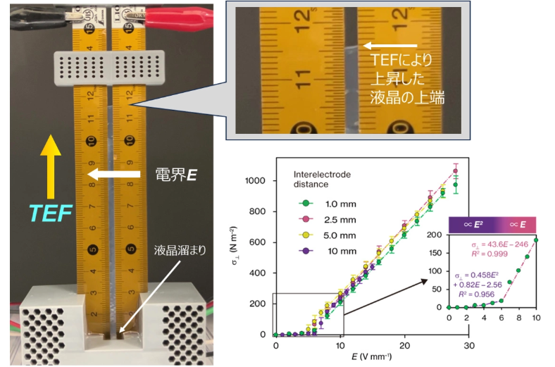 今回、研究チームでは、静電力の源であるMaxwell応力[用語6]に立ち返り、特にMaxwell応力のうち、電界に対して垂直方向に働く応力成分に着目しました。この垂直成分による発生力をTEF(Transverse Electrostatic Force、図1)と名付け、図2に示すような実験系を構築して電極に電圧を印加したところ、液晶材料が電極間を上昇する現象を確認し、TEFの可視化・定量化に成功しました。たとえば電極間距離1 mmあたりわずか20 Vの電圧を印加するだけで液晶が約70 mmも上昇することが明らかになりました。TEFを利用することで電極を固定でき、ショートの可能性を大きく低減することができます。