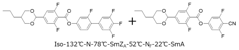 一般的な材料でもTEFは発生しますが、極めて弱い力であるため視認できるほど材料が上昇することはありません。今回使用した強誘電ネマチック液晶(図3)は、比誘電率が約11,000(@100 Hz)、分極が約6 μC/cm2と非常に大きく[参考文献1]、発生するTEFの大きさも一般的な材料の1,000倍以上となる約1,000 N/m2(@30 V/mm)を達成しました(図2右下)。