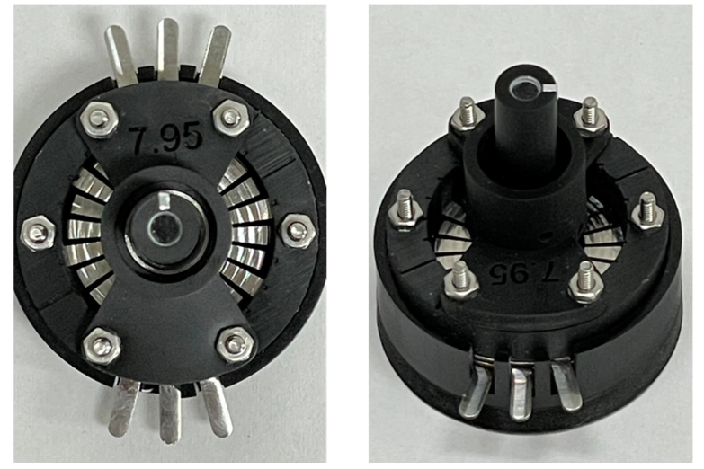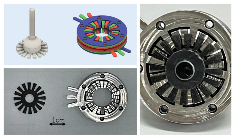 この結果をもとに、図4に示すような3相モータを設計し、固定子3相24極、回転子16極から構成される試作機を作製しました。TEFを利用することで、磁場や磁石を必要とせず、上下の固定子間に電圧を印加するだけで回転子を回転させることができるため、回転子は金属不要でプラスチック材料だけで作製可能となり、軽量化・低慣性化を実現できました。また、スリップリングやカーボンブラシといった回転子への給電機構も不要となるため、構造の簡素化にもつながりました。