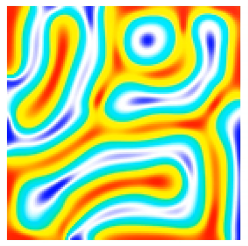 図1. 迷路磁区を持つ鉄ガーネット膜モデルに磁界パルスを印加した際の磁気ドメインの時間変化をシミュレーションした。